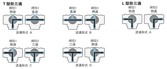 T型閥芯孔道可使三條正交的管道互相連通或切換,起分流或合流作用;L型孔道連接相互正交的兩管道。使另一條孔道切斷,起改變介質流向作用。